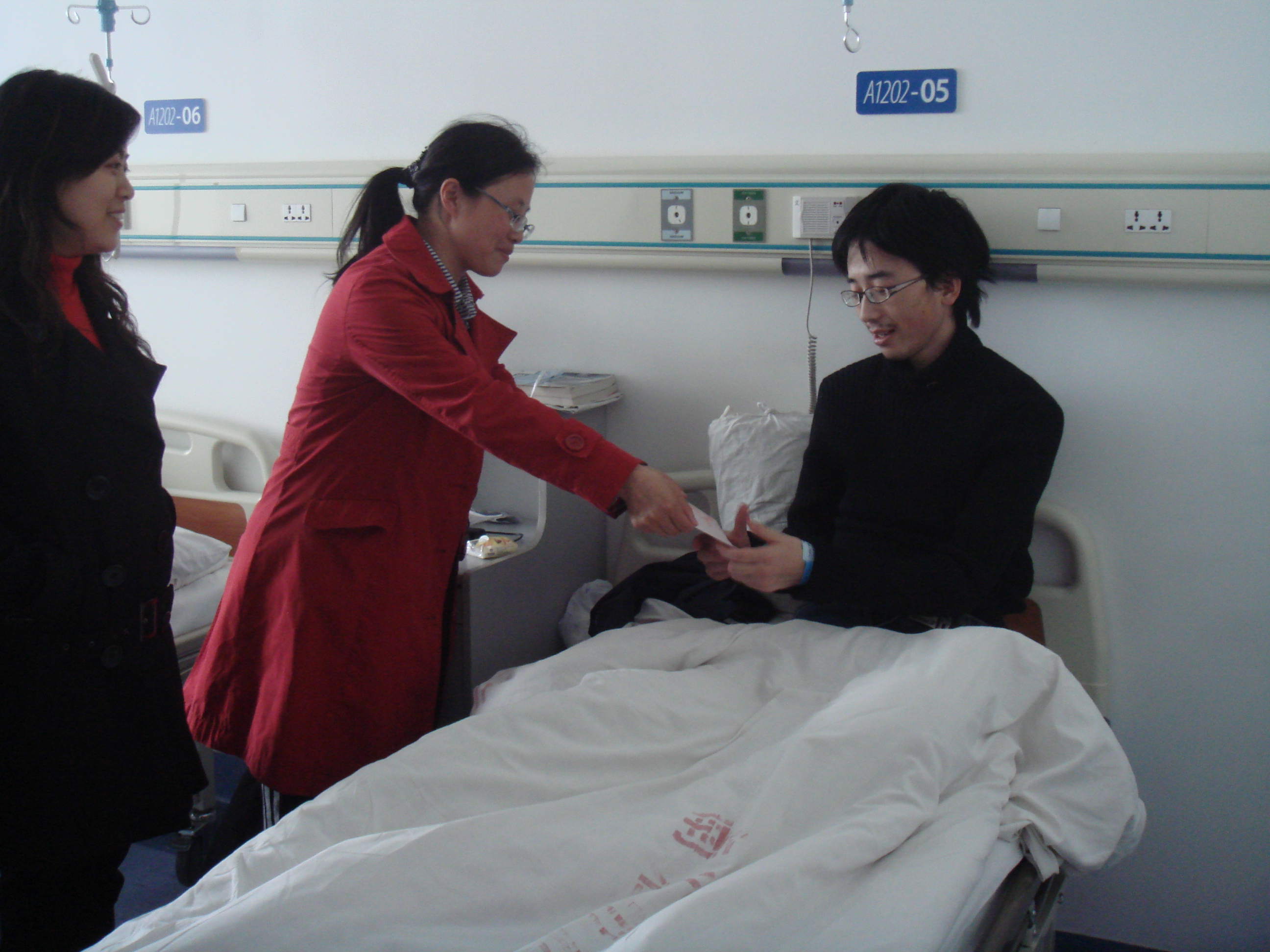 4月20日,我院“春雨基金”负责同学到南汇中心医院慰问因阑尾炎手术住院的2005学生李华夏。4月17日晚来自甘肃的李华夏同学因突发急性阑尾炎被送至南汇中心医院救治,远在老家的父母不能到医院照顾他。得知这一情况,“春雨基金”立即拨出500元慰问金并购买了营养品。计信学院党总支副书记王佳丽老师亲自将慰问金送到李华夏同学手中,并希望他能安心养病,祝他早日康复!辅导员叶涵敏老师也一同前往医院慰问。