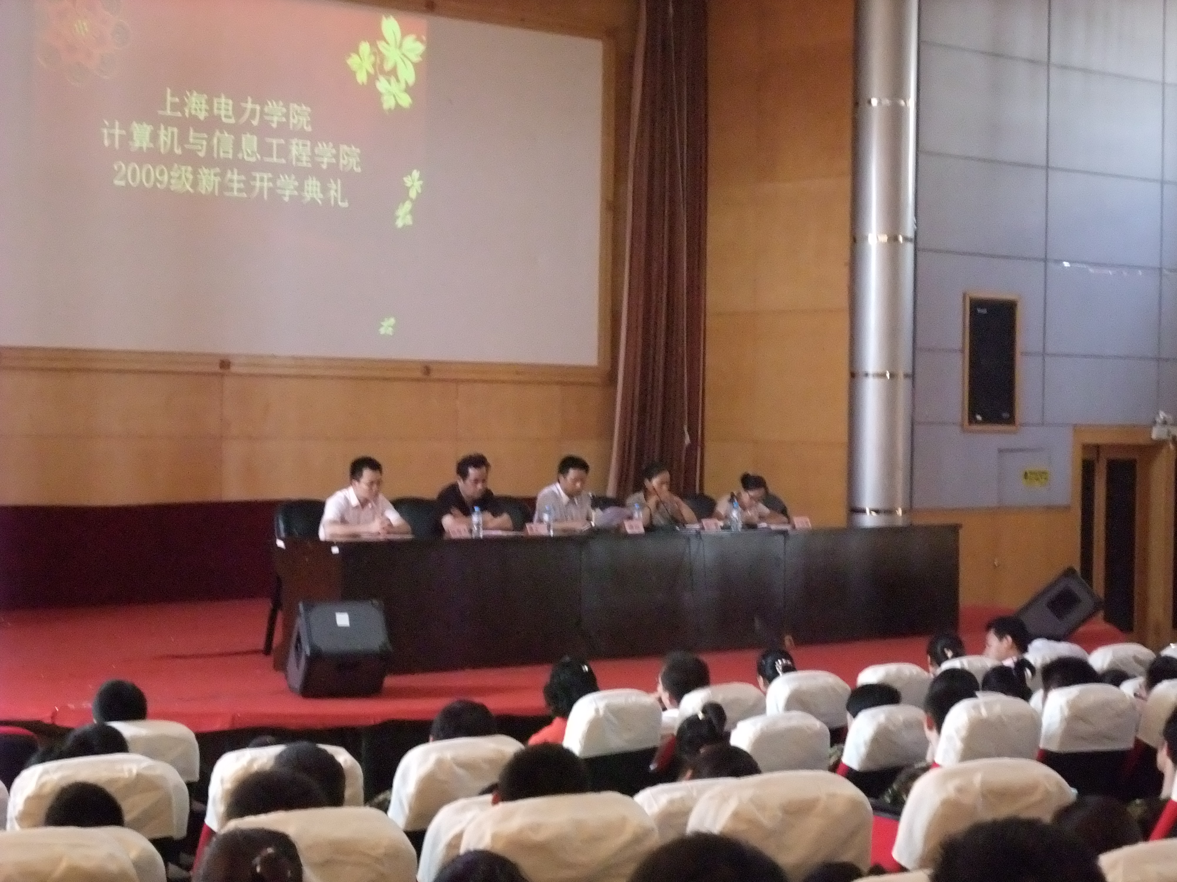 9月7日下午,计信学院在尚智堂举行了2009级新生开学典礼。学院常务副院长唐忠,党总支书记徐广新,教务副院长施正一,党总支副书记王佳丽,院长助理杨俊杰等全讯白菜网领导以及各专业系主任、党支部书记及辅导员出席了大会。大会由党总支书记徐广新主持。