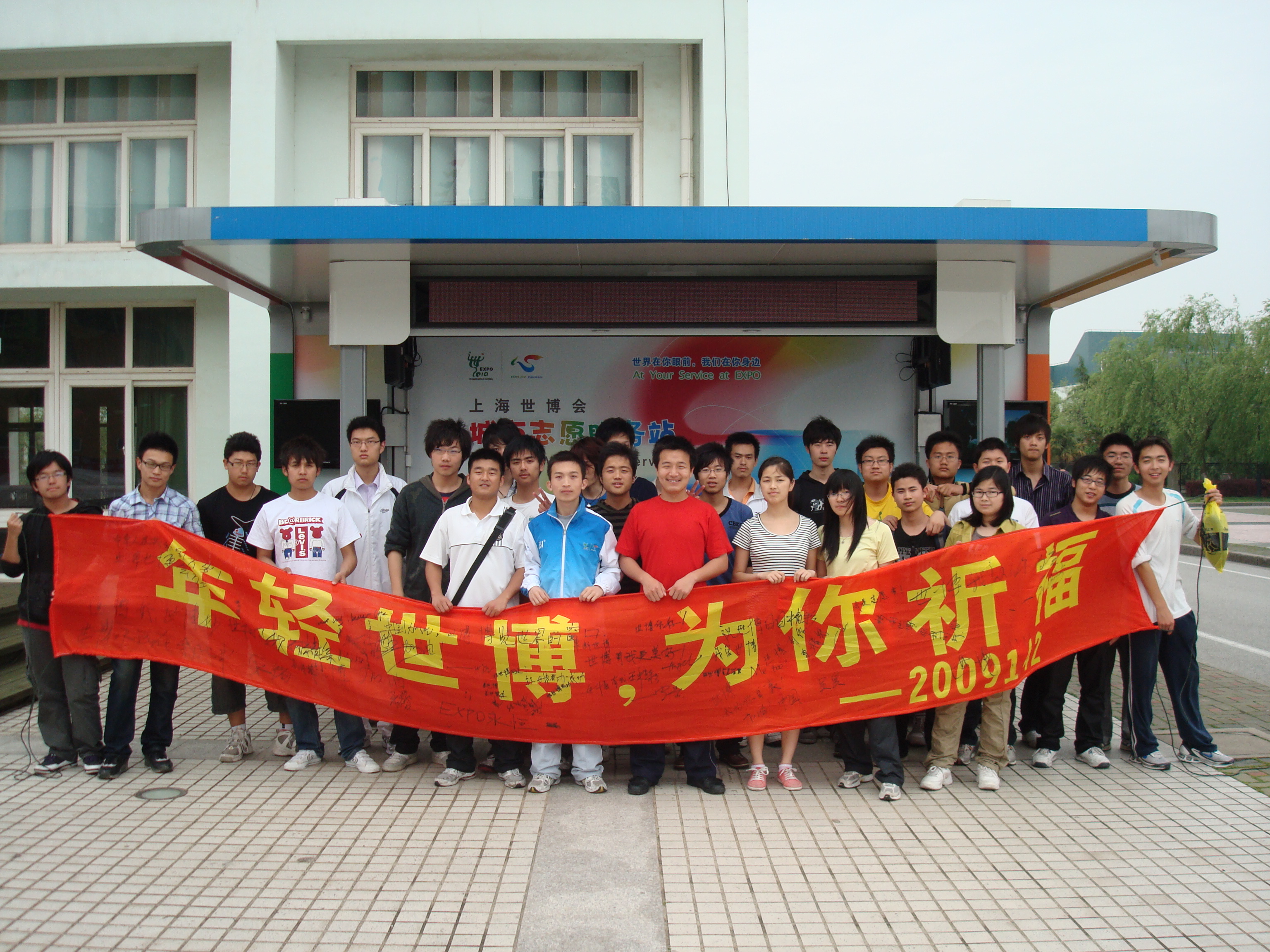 随后,同学们来到我校浦东校区世博服务站点看望正在服务的吴昊同学,最后他们全体成员在世博服务站点合影留念。年轻世博,我们为你祈福!